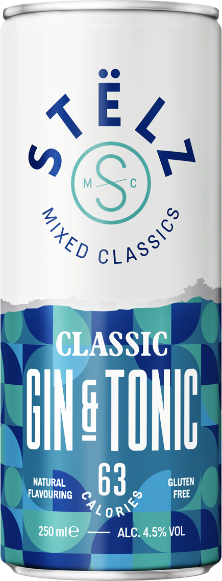 STËLZ Mixed Classic Gin & Tonic: premium craft gin met botanische ingrediënten, zoals jeneverbes, citrus en met een vleugje komkommer. Bevat slechts 63 kcal, zoetstof 4,5% alc.