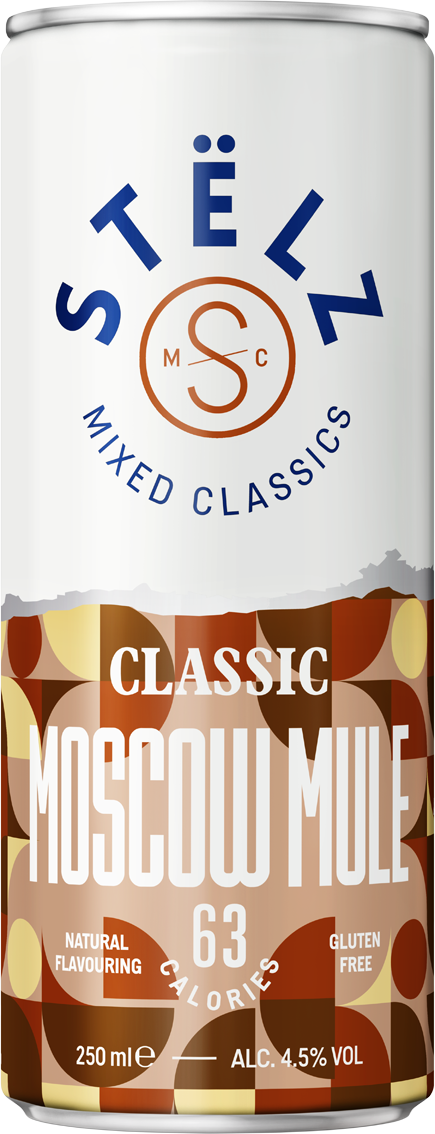 STËLZ Mixed Classic Moscow Mule is een premium craft wodka gemixt met gemberbier en een vleugje limoen, kaneel en kruidnagel. Bevat slechts 63 kcal, zoetstof, koolhydraten en 4,5% alc.