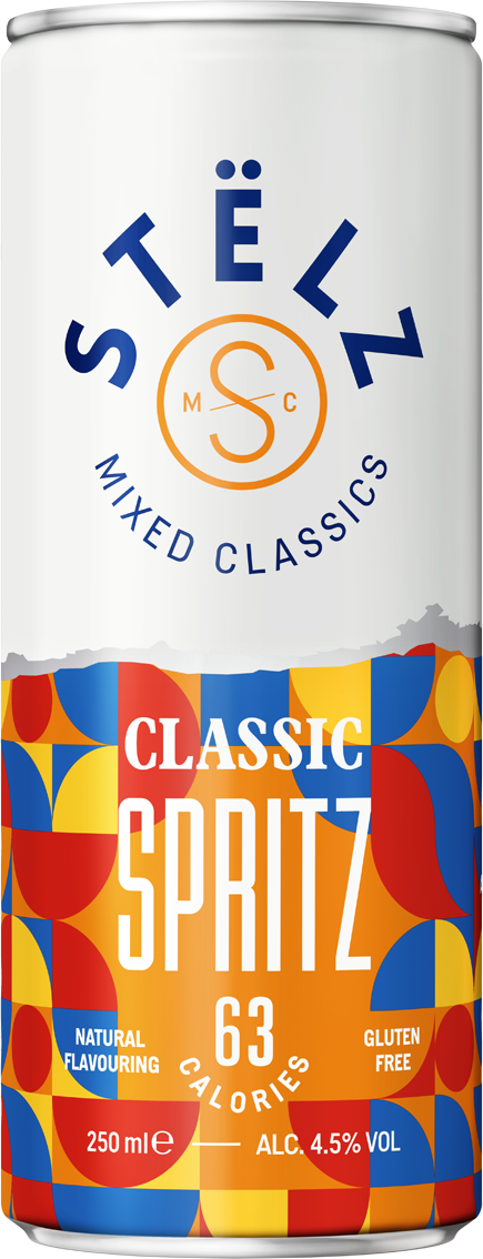 STËLZ Mixed Classic SPRITZ bevat sprankelend water, 4,5% alc, zoetstof en een vleugje sinaasappelsmaak, en vormt zo een ‘ready to drink’ cocktail met 63 kcal in een blikje!